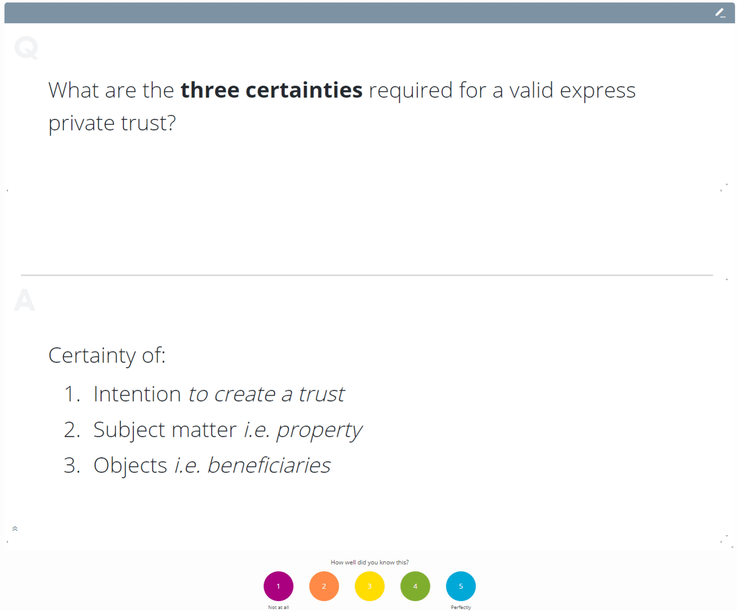 Over 240 digital flashcards on Trusts covering the SRA syllabus for SQE1 and SQE2. Access a preview of 10 flashcards here.